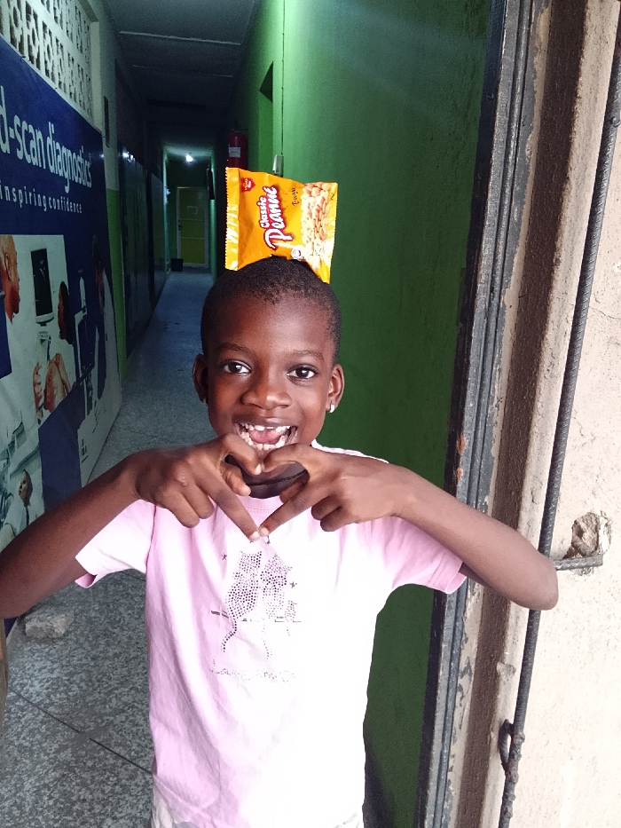 A young girl in a pink shirt stands in front of a doorway, holding her hands in a heart shape. A bag of "Classic Peanut" snacks sits balanced on her head. Behind her is a hallway with a green wall and a sign for "Med-Scan Diagnostics." The hallway is slightly darker, leading to a yellow door. Part of a doorway and wall are visible on the right, near the girl. She is smiling broadly, showing her teeth.