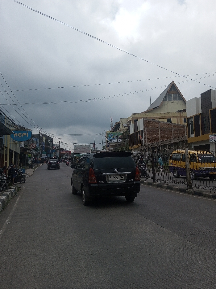 The image displays an urban street scene under a heavily overcast sky, dominated by dense grey clouds and overhead utility lines. The paved asphalt road stretches into the distance, occupied by vehicles traveling away from the viewer. In the mid-ground, a black Toyota Innova SUV/MPV with an Indonesian license plate "D 1632 HC" is prominent, moving forward. Behind it, a dark sedan is visible. On the far right, partially obscured by a decorative black metal fence, a yellow and purple van is present. On the left side of the street, several motorcycles are parked along the sidewalk, near a few indistinct pedestrian figures. Buildings line both sides of the thoroughfare. On the left, commercial structures feature storefronts, one displaying a blue "HGPI" sign. On the right, a multi-story building with a distinct light-colored, steep-pitched roofline stands out. Adjacent to it, a structure exhibits signs of construction or renovation with exposed brickwork and wooden support elements, near which a red and white flag (consistent with the Indonesian flag) is visible. Further along the right, a building with a modern, blocky facade is present. The general environment suggests an active city street. The visible Indonesian license plate contradicts the requested location of Thanthirimale, Sri Lanka; the scene appears to be an urban setting in Indonesia.