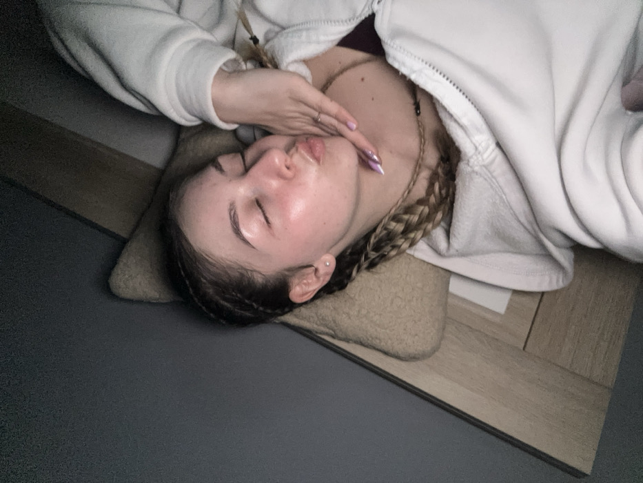 A female subject is depicted in a close-up, diagonal orientation. She is lying on her right side, resting her head on a light brown, textured pillow. Her eyes are closed, and her lips are pursed in a "kissing" gesture. Her skin appears fair with a slight sheen on the cheeks. Her hair is styled in multiple thin braids, extending over her left shoulder and down her chest. A light-colored, possibly white or off-white, zippered hoodie or sweatshirt is worn over a darker top, parts of which are visible at the neckline. The subject's left hand is positioned with fingers splayed against her chin and jawline; the fingernails are almond-shaped and painted with a lavender or light purple polish, featuring white tips. A plain silver-colored ring is visible on the ring finger of her left hand. A thin, braided necklace with dark beads is visible around her neck. The background consists of a dark gray or blue-gray vertical surface on the upper left, transitioning to a light wood-grain surface on the bottom right. The exact location in the city of Yambol, Bulgaria, cannot be determined from the visual information provided within the image.
