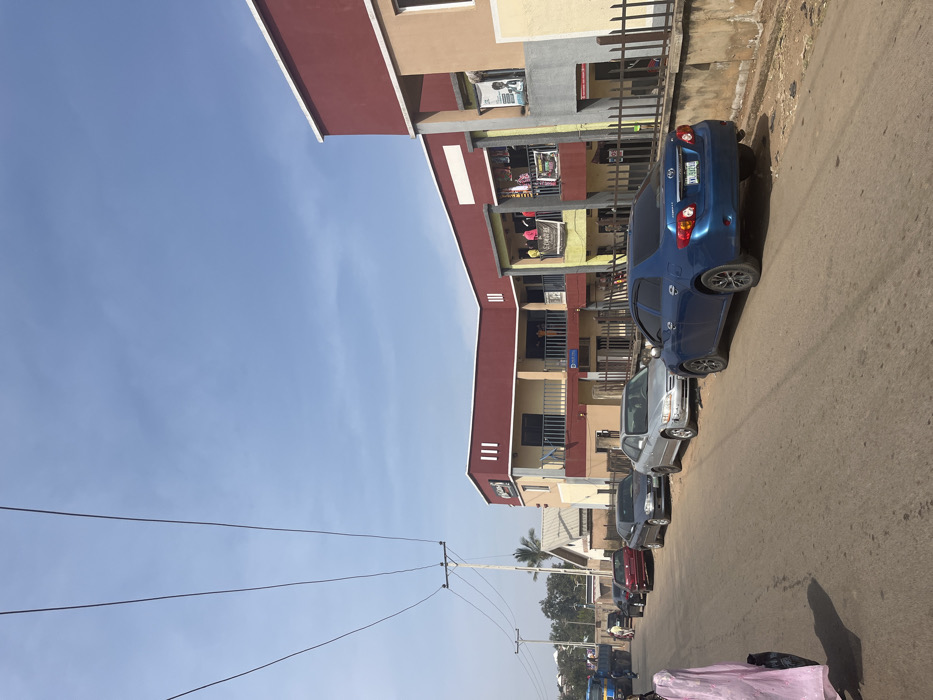 The image displays a daytime street scene in Jos, Nigeria, featuring commercial buildings, parked vehicles, and visible infrastructure under a clear, light-blue sky