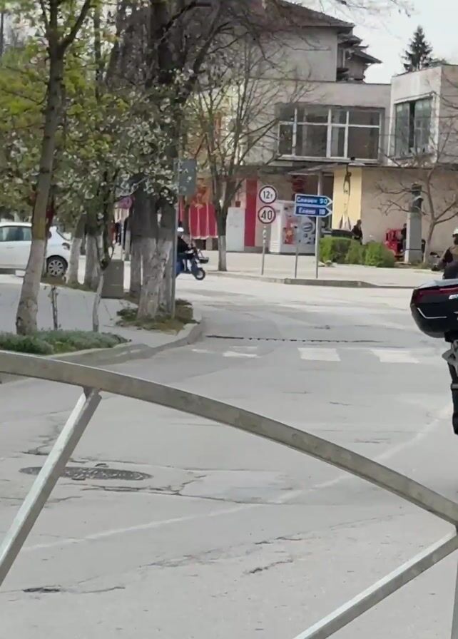 group of motorcyclists riding through a town in Bulgaria. The camera is positioned behind a metal barrier with the town's crest on it. A large tree is also in the foreground on the right side of the frame. The motorcyclists are traveling away from the camera, across a crosswalk and down a street lined with buildings. There is a sign indicating directions to Sliven and Elena. Other people can be seen on the sidewalks and near the buildings. The day appears to be sunny.