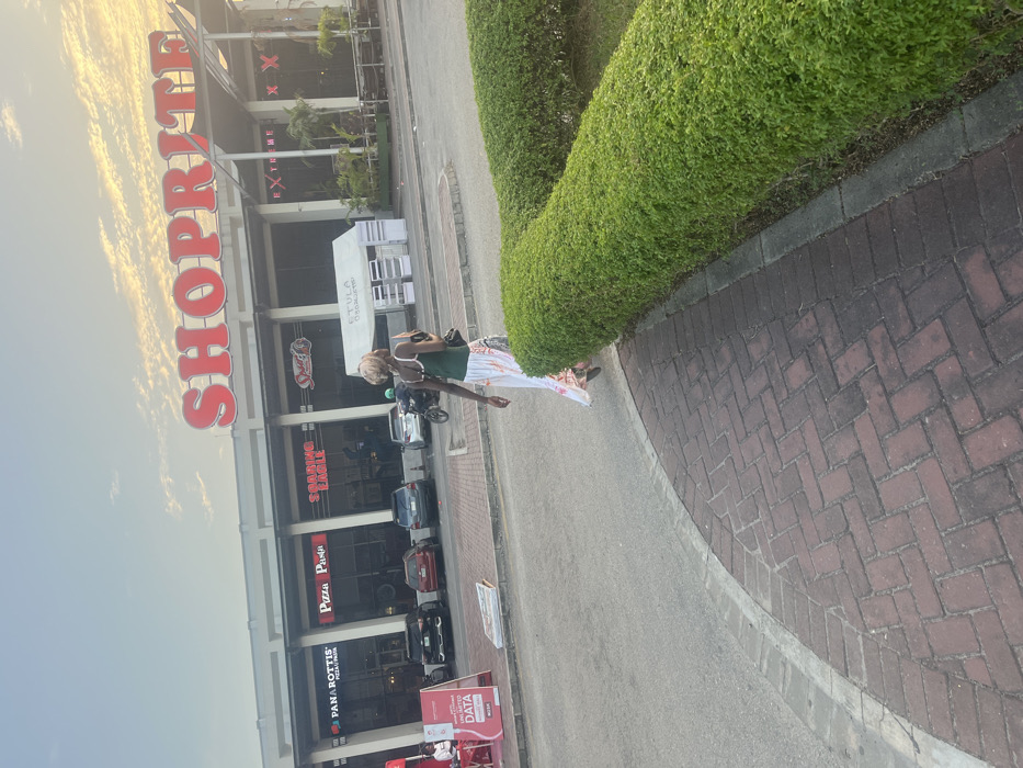 A woman wearing a white, floral skirt and green top walks alongside a sidewalk bordering a lush, green hedge. Behind her is a multi-story building with the word "SHOPRITE" vertically displayed in red. Various eateries and shops occupy the building's ground floor. Cars are parked along the curb in front of the building. The scene is bathed in the warm, golden light, suggesting either a sunrise or sunset.