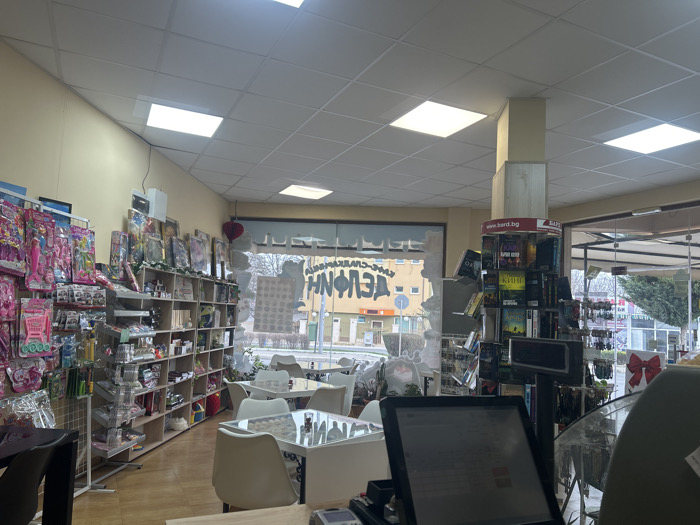The image depicts the interior of a brightly lit commercial establishment, likely a gift shop or bookstore with a café area, located in Unknown, Bulgaria