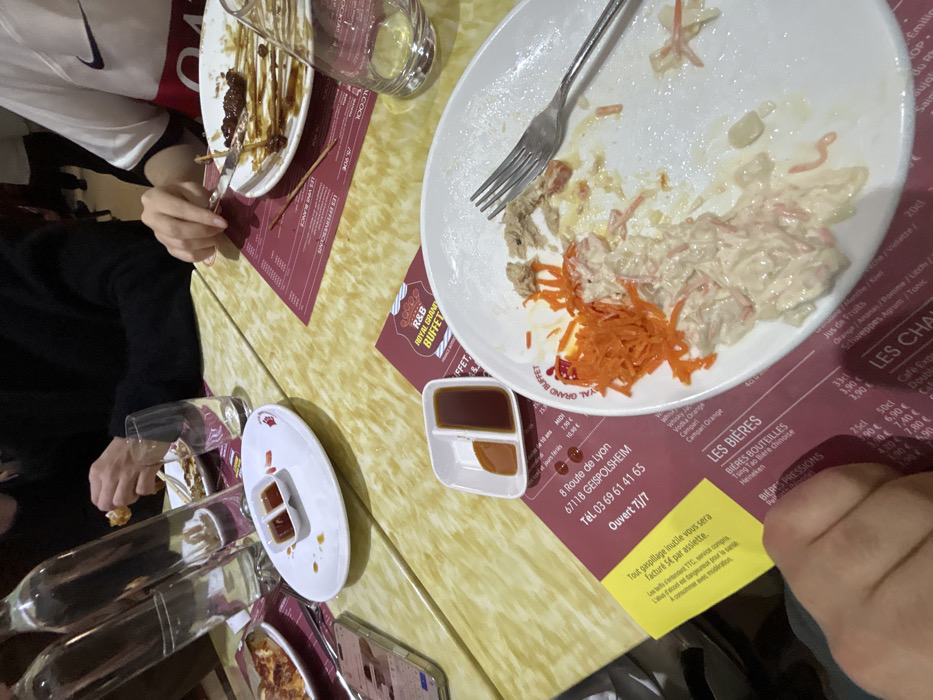 An overhead shot captures remnants of a meal on a table. A white plate holds shredded carrots and slaw, partially eaten. Next to it is a small condiment dish. A second plate with leftover food is visible in the upper left. Silverware is scattered around the plates. The table is covered with menus featuring drink prices and rules about wasting food, printed in French. Several empty glasses and the edge of a smartphone are also on the table.