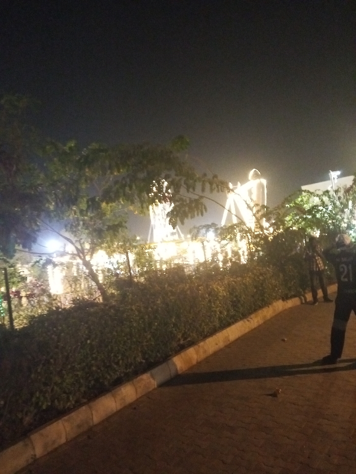 A nighttime scene captures an illuminated Ferris wheel and building structure in the background. In the foreground, a dense, clipped hedge runs along a concrete curb. A dimly lit paved pathway stretches toward the bottom, with indistinct figures of people to the right. The individual nearest to the camera wears a jersey with the number 21 visible on the back. Trees with sparse foliage are scattered throughout the scene.