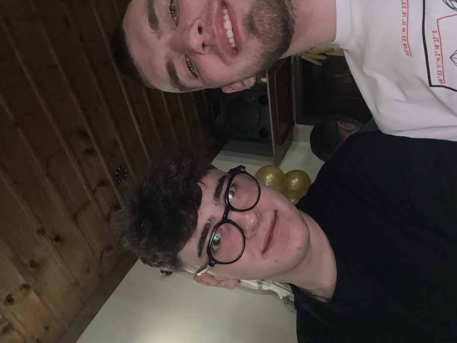 Two young adult males are captured in a close-up, indoor photograph, looking directly at the camera with smiles. The male on the left has dark, styled hair, wears round black-rimmed glasses, and a black long-sleeved shirt. The male on the right has short dark hair, light stubble on his chin, and wears a white long-sleeved shirt featuring red printed text including GPS coordinates for locations in Italy and France. In the background, a wooden plank ceiling is visible, along with a light-colored wall. Two deflated gold balloons are present on the left side of the background, and a large dark speaker rests on a wooden shelf in the upper right. A third individual, identified only by the back of their head and shoulder, is partially visible in the lower right background. The lighting is dim and warm. The precise location within the city of Karlovo, Bulgaria, is not visually identifiable from the image content.