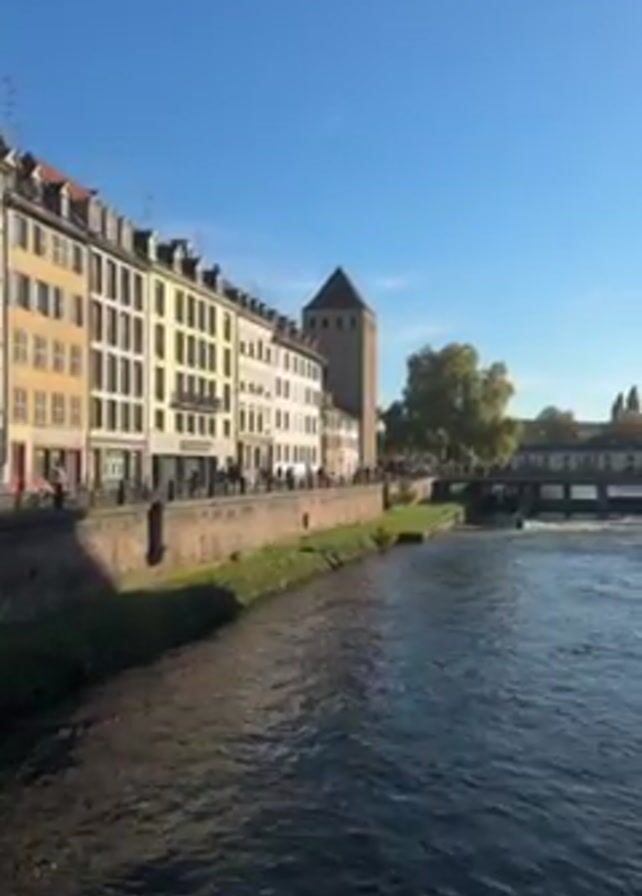 The video depicts a tranquil river scene in an urban setting. A row of multi-story buildings lines the riverbank, their facades exhibiting a mix of neutral tones. A stone tower punctuates the line of buildings. The river itself is dark and reflects sunlight, flowing with a visible current. In the distance, a bridge spans the river. People can be seen strolling along the pathway that runs parallel to the river and the buildings. The sky is a clear blue.