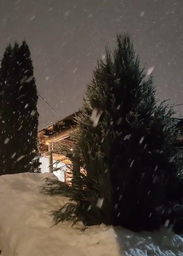 The scene is an outdoor winter night. Large snowflakes fall densely against a dark sky. In the foreground, there is a deep snowdrift, and in the background, two coniferous trees. The outlines of a building can be seen, lit from within, between the trees. A wire stretches through the scene, partially obscured by the falling snow.