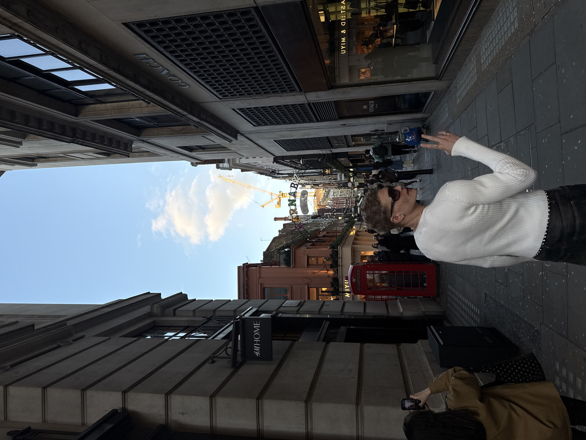 The image captures a street scene in London, United Kingdom. A person in a white sweater and sunglasses stands on the right side of the frame, holding up a hand. Across the street, a traditional red telephone box is visible. Shopfronts line the street, including H&M Home and Coach stores. A construction crane is visible in the distance. The sky is partially visible between the buildings. Another person is taking pictures, holding a phone, on the right-hand side of the frame at the bottom.