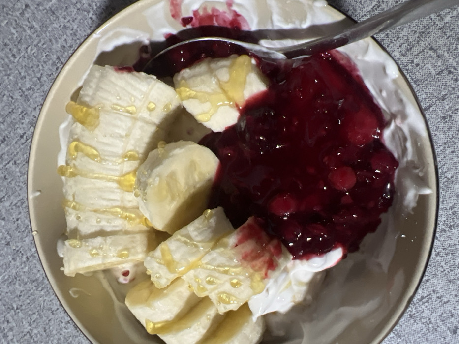 - "A tan-colored bowl contains a dessert featuring sliced bananas drizzled with honey, a dark red berry compote, and dollops of white whipped cream" by FM-YPNSq2, licensed under CC BY 4.0