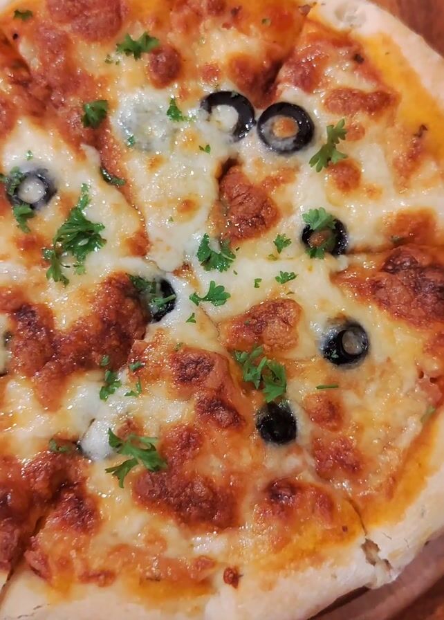 - "pizza on a wooden serving board, placed on a wooden table" by FM-WroXJ3, licensed under CC BY 4.0