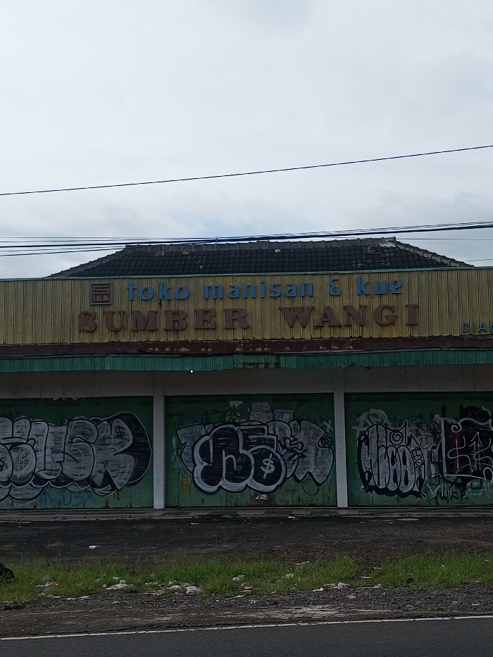 A dilapidated building with faded yellow siding and green trim is covered in graffiti. The sign above reads "Toko Manisan & Kue Sumber Wangi" in faded red lettering with blue writing above. The building's facade shows signs of disrepair. The graffiti covers the lower portion of the structure. A road and some grass are in the foreground. The sky is overcast.