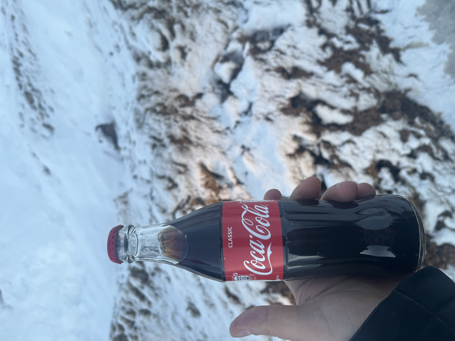 - "A human right hand, clad in a dark sleeve, holds a full, clear glass bottle of Coca-Cola Classic against a snowy outdoor background" by FM-uf9rE3, licensed under CC BY 4.0