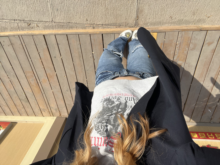 An overhead shot depicts an individual standing outdoors on a light-colored wooden plank floor in Jiayuguan, China. The person is partially visible, from the chest to the feet. They wear a grey long-sleeved shirt featuring "SAINT" and a tiger graphic, with additional text "And Forever" and "THE FUTURE IS WORTH FIGHTING FOR." Light blue ripped jeans and white sneakers with gold accents complete the lower attire. A dark blue or black open jacket or cardigan is worn over the shirt. Reddish-blonde hair is visible over the left shoulder. The midriff is exposed between the shirt and jeans. The wooden floor transitions to a rough concrete surface in the immediate foreground. To the upper left, a red column or structural element with a yellow banner displaying Chinese characters "百分百真" (bǎifēnbǎi zhēn - 100% genuine) is partially visible, indicating a building or stall. Strong sunlight casts distinct shadows across the wooden planks, suggesting a clear day.