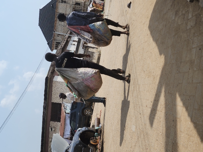 The image depicts an outdoor urban scene in Lagos, Nigeria, under a clear to partly cloudy sky. Three adult males are present on an unpaved, sandy-brown surface. In the mid-ground, two men walk away from the camera, each carrying a large, heavily laden sack over their left shoulder. The lead man wears a black t-shirt with "USHER" printed on the back, dark trousers, and sandals, carrying a light-colored sack. The second man, positioned to his right and slightly behind, wears a plaid shirt, dark trousers, and sandals, carrying a multi-colored sack. Long, distinct shadows are cast on the ground, indicating strong sunlight. On the left side of the frame, a third man in a light-colored top and dark cap stands next to a dark sedan with its hood open and the front-left wheel removed, exposing brake components. Behind this sedan, a dark SUV is parked. Metal debris and a cylindrical object lie on the ground near the sedan. In the background, structures include a multi-story building with a flat roof on the left, and a two-story concrete building under construction with a dark, tiled roof on the right. Overhead utility wires are visible against the sky.