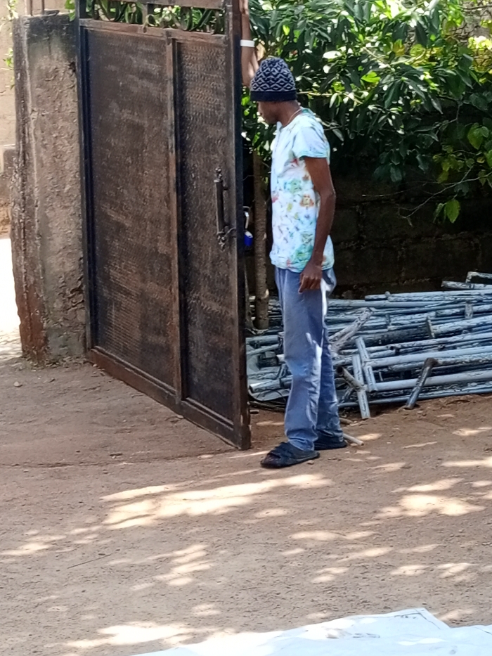 An individual is standing in Gura Top, Nigeria, near a partially open, dark metal double-leaf gate