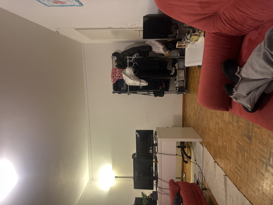 This image depicts an indoor scene within a residential unit in Villaz, Switzerland. The perspective is from a low vantage point, looking across a room. In the foreground, the lower legs of a person are visible, resting on a red upholstered sofa. The person is wearing light grey distressed jeans with ripped fabric at the knees and black socks. Adjacent to the sofa on the right, a white coffee table holds several small decorative items, including a yellow toy car and framed pictures. The floor is covered with parquet flooring in a herringbone or mosaic pattern. A light-colored, patterned rug extends from the foreground towards the mid-ground, partially obscuring the floor. In the mid-ground on the left, a white desk is positioned against a white wall. Two dark computer monitors, possibly ASUS brand, are centrally placed on the desk, displaying blank screens. Cables are visible on and around the desk, connecting to the monitors and other devices. A small potted plant with dark foliage is on the left side of the desk. A black office chair with wheels is partially visible beneath the desk. To the left of the desk, a floor lamp with a luminous white cylindrical shade provides primary illumination, casting a bright glow on the white wall and ceiling. Further to the right in the mid-ground, a metal garment rack on wheels is heavily laden with various items of clothing, including jackets, sweaters (one white hoodie visible), and black garments on hangers. A black shoulder bag with "SUPREME" visible on its strap hangs from the rack. The bottom shelf of the rack contains several light-colored storage baskets. On the far right, a white door with a silver handle is slightly ajar. Above the door, a blue and white decorative textile piece, featuring a central red motif, is affixed to the wall. The walls are uniformly white, and the ceiling is also white with a slight textured appearance. A thin, white decorative trim runs along the top of the walls where they meet the ceiling.