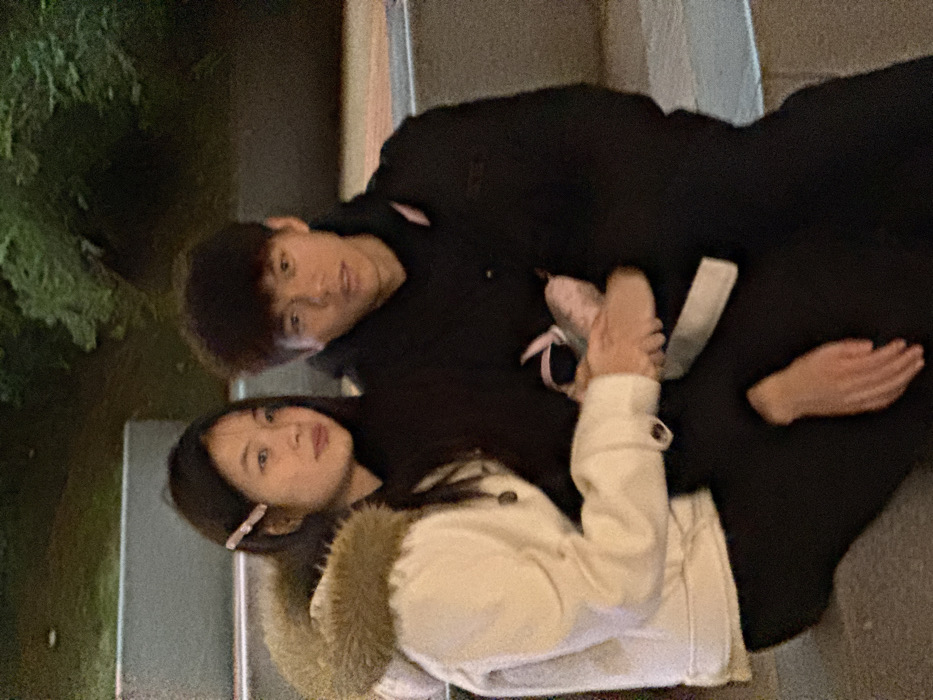 The image depicts two East Asian individuals, an adult female and an adult male, seated side-by-side in an outdoor, nighttime setting