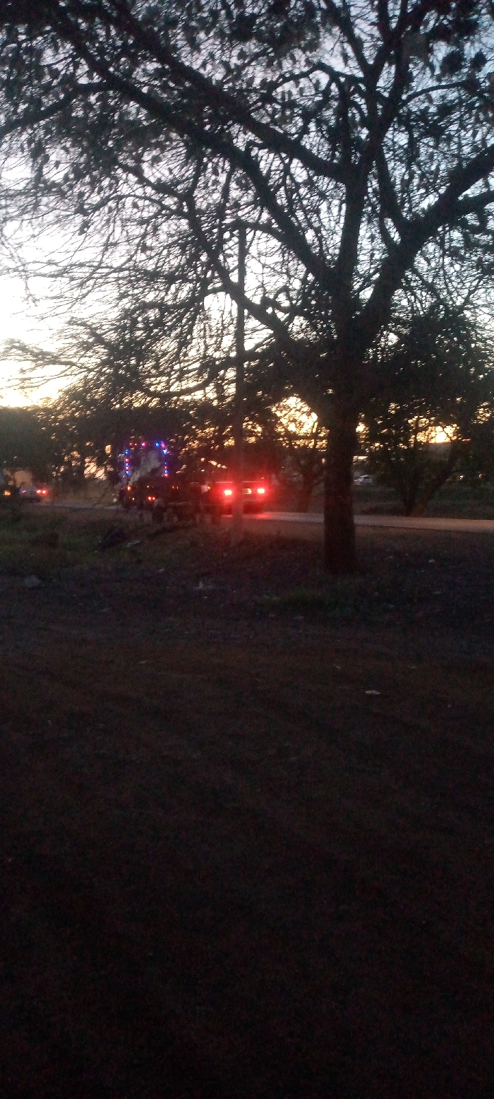 A twilight scene shows a road lined with trees silhouetted against a pale sky. A vehicle adorned with colorful lights and followed by others with red taillights drives along the road. In the foreground, the ground is dark, with grass or earth barely visible. The focus is on the vehicles illuminated against the fading light.