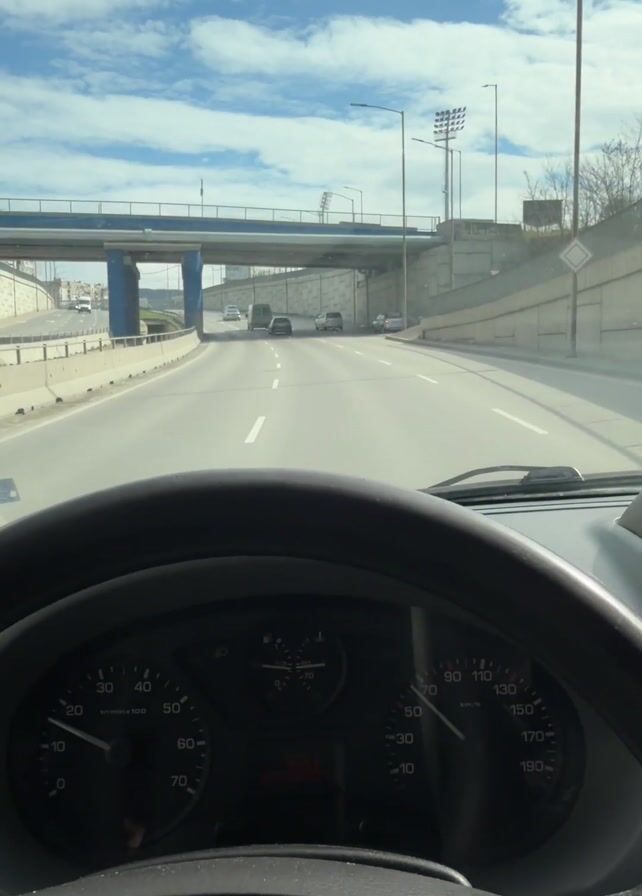 The camera, positioned behind the steering wheel of a vehicle, faces forward and records the driver's perspective as they travel down a highway. The sky above is partly cloudy. A bridge passes overhead, with a secondary road suspended atop of it. Street lamps illuminate the highway on both sides. In the distance, multiple vehicles are seen ahead on the highway. The dashboard of the vehicle displays its speedometer, fuel gauge, and other essential information. Loud music is playing. The vehicle appears to be moving at a moderate speed.