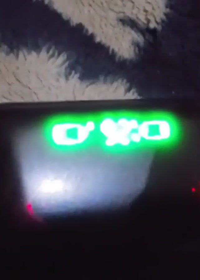 A small, black electronic device sits on a patterned rug. The device displays a green digital readout, which includes a battery symbol and other icons. Red lights glow on the device's sides. The rug has a white and dark blue pattern. The device remains still throughout the video.