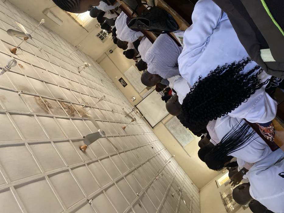 The image depicts an indoor lecture hall or classroom in Jos, Nigeria, captured from a slightly elevated perspective looking forward and across the room