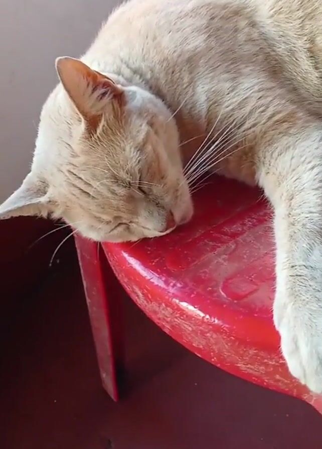 light orange tabby cat asleep on a red plastic stool. The cat is curled up with its head resting on the edge of the stool and one paw dangling. The stool is situated on a dark red surface next to a white wall. Music plays in the background.