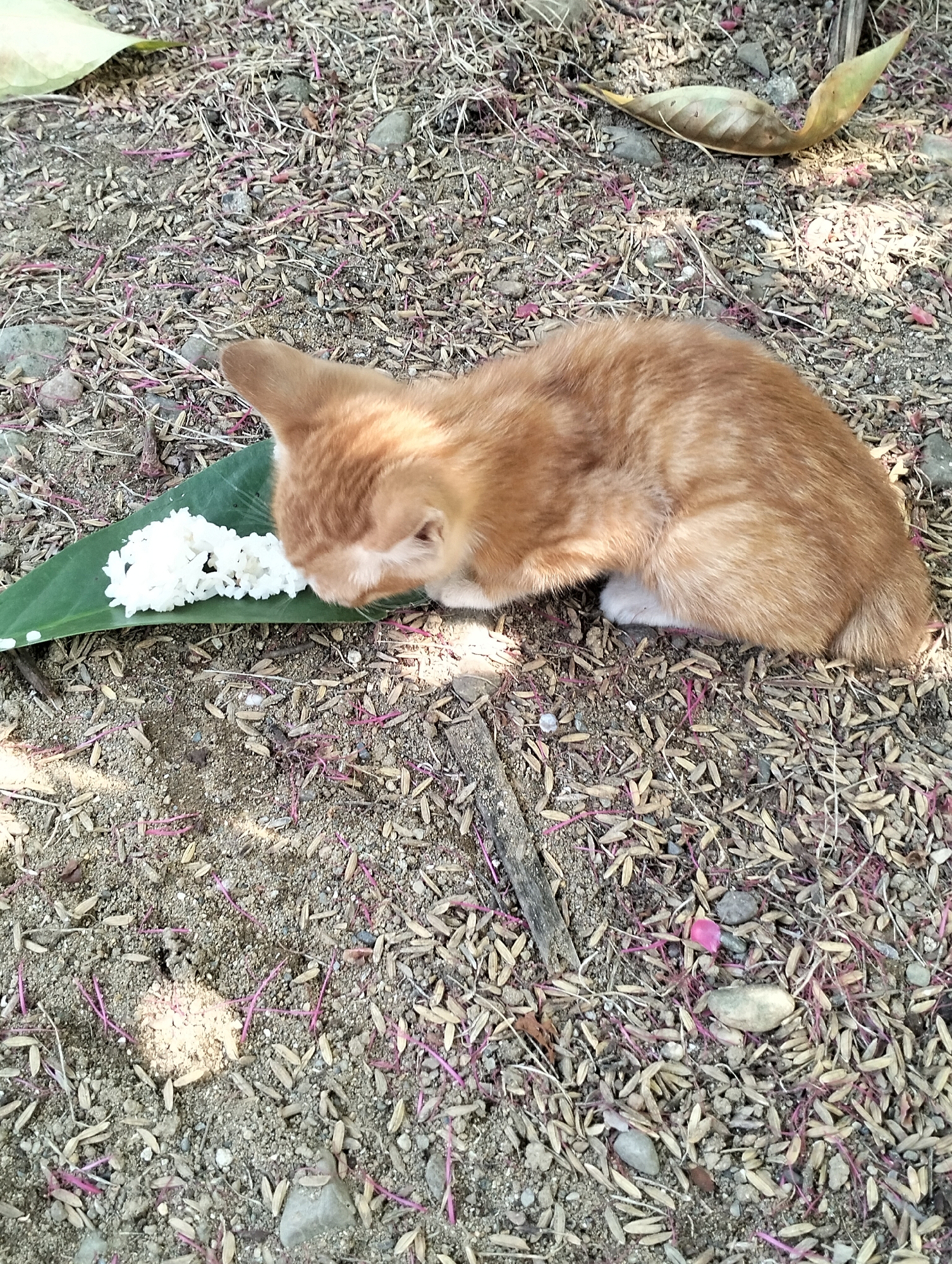 An orange kitten is observed eating a portion of white rice served on a dark green leaf, positioned on sandy ground. The kitten is oriented left, with its head lowered to the leaf, actively consuming the rice. Its fur is primarily orange-brown with lighter patches visible on its underside and paws. The ground beneath consists of loose, light brown soil mixed with numerous small gray and brown pebbles, dry, light brown rice husks, and scattered thin, bright purple plant debris. Several dried leaves, one light green and curled, and one brown and flattened, are present on the ground. Sunlight illuminates the scene from the right, casting subtle shadows. This event occurs outdoors in Meunasahalue, Indonesia.