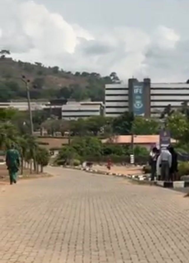 street scene with a building that says "Great Ife" in the background. The sky is cloudy and there is a hill in the distance. There are several people standing on the side of the road. The camera pans to the right to show a street with several parked cars. There are also tall metal towers.