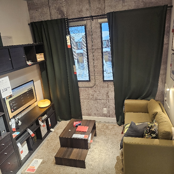 - "A staged living room scene features dark green curtains framing two windows showcasing a snowy, wintery scene outside" by FM-63mZD2, licensed under CC BY 4.0