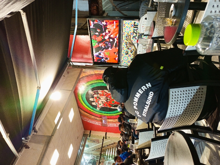 A sideways view of a street cafe. People are seated at tables, partially obscured by a black backpack with "FC POMMERN STRALSUND" printed on it. Above, televisions display images. The cafe's exterior features a colorful, patterned ceiling design. Tables and chairs are visible, along with various items like a water bottle and glassware. The scene is illuminated by streetlights and the cafe's lighting.