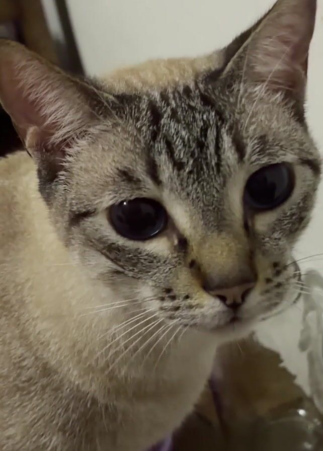 A close up shot shows the face of a cat. The cat has tan and grey patterned fur, large black eyes, and long white whiskers. In the background is a white wall and a glass bottle and a purple object are partially visible. A voice is heard saying “kiko, kiko”. The cat briefly looks upward.