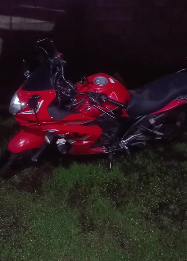 A static shot shows a red motorcycle parked on a patch of green grass in what appears to be a dark outdoor setting