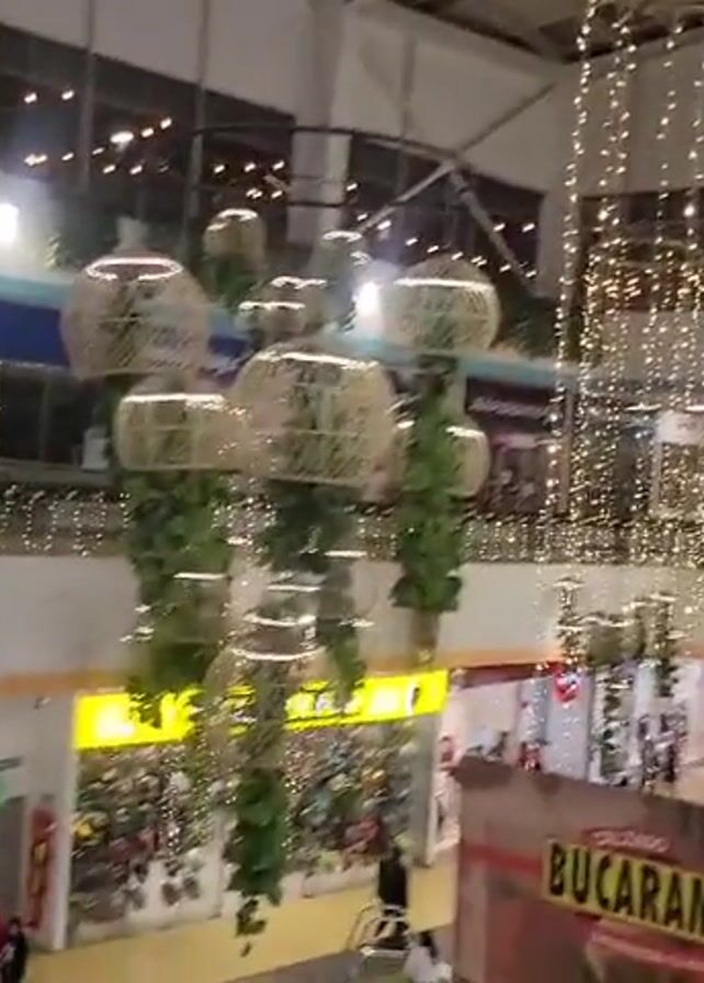 interior of a shopping mall. People are walking around on different levels. The mall is decorated with hanging lights and plant displays. One section has "VIVE" displayed prominently. There are several storefronts visible.