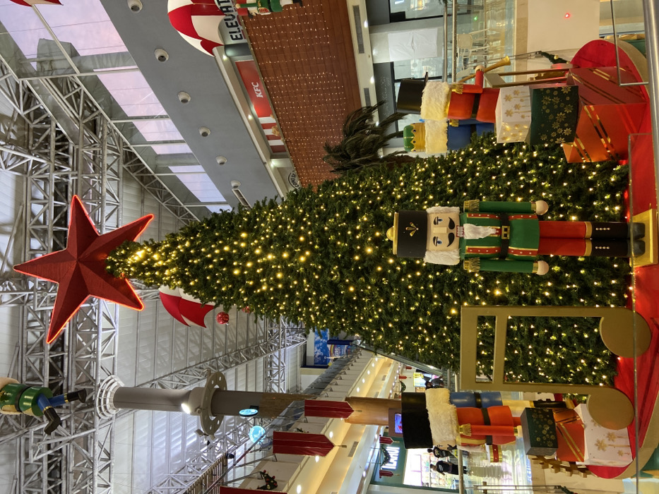A massive Christmas tree dominates the scene, adorned with countless lights. A large red star sits atop the tree, which is decorated with a giant nutcracker. Other decorative elements include music note props and colorfully wrapped "presents" beneath. The surrounding architecture appears to be within a shopping mall, as a "KFC" sign is visible, and the tree stretches upward into the vast space.