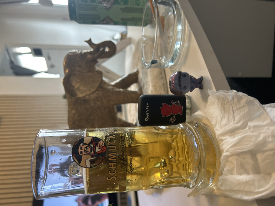 The scene depicts an indoor setting, presumed to be a private residence in Dresden, Germany. In the foreground, a clear glass mug, filled with a golden, carbonated beverage resembling beer, rests on a white surface. The mug features a label with "SCHMUCKER Premium" text and a circular emblem showing a smiling man in a tricorne hat holding a beer. Condensation is visible on the glass, and a crumpled white paper napkin is positioned beneath it, appearing to absorb moisture. To the right of the beer mug, a black lighter stands upright, bearing the text "Teufelchen" (German for "little devil") and a red cartoon devil illustration. Adjacent to the lighter is a small, approximately 5 cm tall, purple and grey stylized figurine with a large head, resembling a collectible toy. Further right, a circular, clear glass ashtray contains a partially smoked hand-rolled cigarette or joint and a small quantity of grey ash. In the mid-background, a textured, golden-colored figurine of an elephant, with its trunk raised, stands on a lighter-colored surface. A green beverage can, showing a partial "S" logo, is partially visible on the far right. The blurred background reveals light-colored vertical paneling on a wall, a doorway leading to another room, and ambient light suggesting a window or light source. No individuals are present.