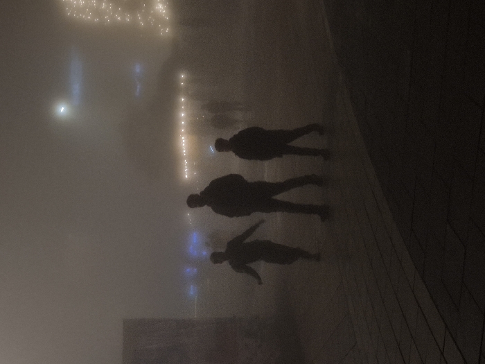 The image displays a foggy or misty nighttime scene within the French Village area of Bà Nà Hills, Đà Nẵng, Vietnam. Three silhouetted figures are prominent in the foreground, walking generally towards the right on a paved surface. The leftmost figure, an adult or youth, is captured mid-stride with arms slightly extended. A central adult figure, clad in dark clothing, walks upright. To their right and slightly behind, a smaller figure, likely a child, also walks in dark attire. In the background, obscured by dense fog, are numerous diffuse light sources: warm-toned decorative lights strung horizontally, distinct blue lights, and a very tall, brightly illuminated structure on the far right resembling a large Christmas tree. Indistinct human silhouettes are visible further back through the fog. A large, diffuse light source, possibly the moon or a strong artificial light, is visible high in the sky through the atmospheric conditions. A dark, rectilinear structure is partially visible on the far left.