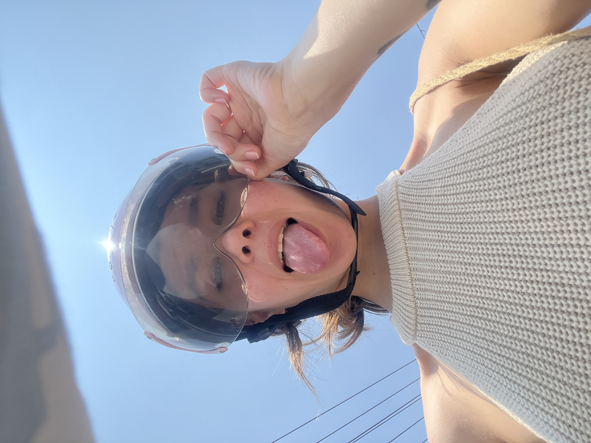A selfie shot looking upward shows a person wearing a motorcycle helmet with the visor partially raised, sticking their tongue out