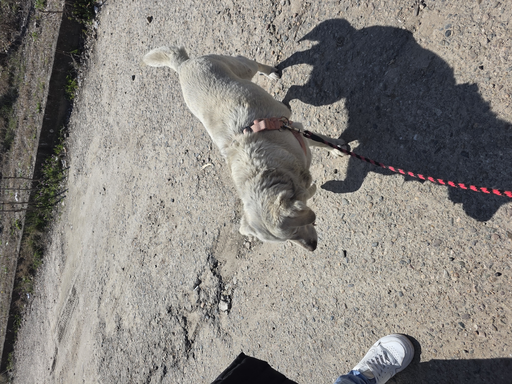 An overhead shot shows a dog on a leash, a person's leg with a white tennis shoe, and the shadow of a person holding a leash on a gravel or dirt surface. The dog is tan or white, with a pink harness and a red and black leash. The edge of a patch of grass, possibly next to a road, is on the left side of the image. The location is unknown.
