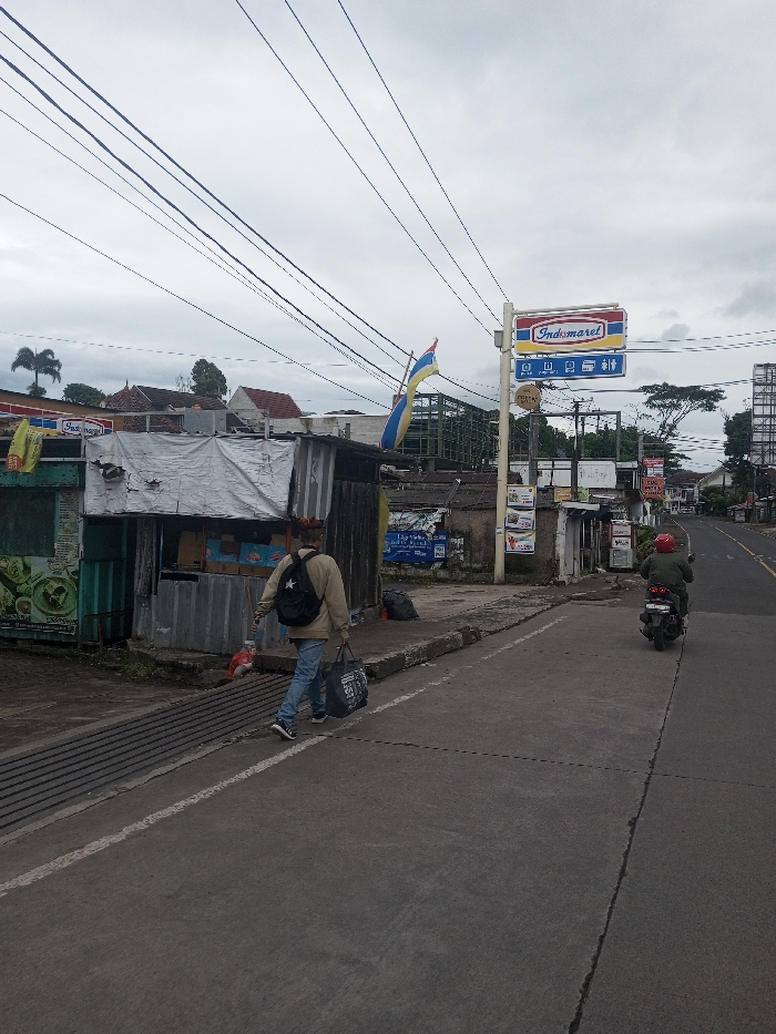 An overcast sky hangs over a street scene featuring two individuals and commercial structures. A pedestrian, wearing a light brown jacket, blue jeans, and a black backpack with a white star logo, walks away from the viewer on the left side of an asphalt road, carrying a black bag in their left hand. A metal drainage grate runs parallel to the road next to the pedestrian. Further down on the right side of the road, a person wearing a red helmet and a dark jacket rides a black motorcycle, also moving away from the viewer. A prominent Indomaret sign, displaying its red, blue, and yellow logo along with symbols for ATM, Wi-Fi, and toilet, is mounted on a pole to the right of the road. On the left, a series of small commercial structures, constructed from corrugated metal and partially covered by a white tarp, line the roadside; one structure is green with a food graphic. A yellow and blue flag flies from a pole behind these structures. In the mid-ground, a large green scaffolding structure is visible. Numerous black utility lines crisscross the upper frame. Distant buildings, palm trees, and other foliage are present in the background. Black trash bags are visible on the ground near the commercial structures.