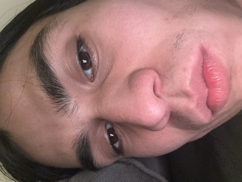 A close-up of a person's face, taken from a low angle while lying down. The face is centered with brown eyes, thick eyebrows, a prominent nose, and full lips. A few facial hairs are visible. The skin has a slight shine, suggesting a smooth texture. The person's head rests on a gray-colored object. The overall image is well-lit, highlighting the facial features.