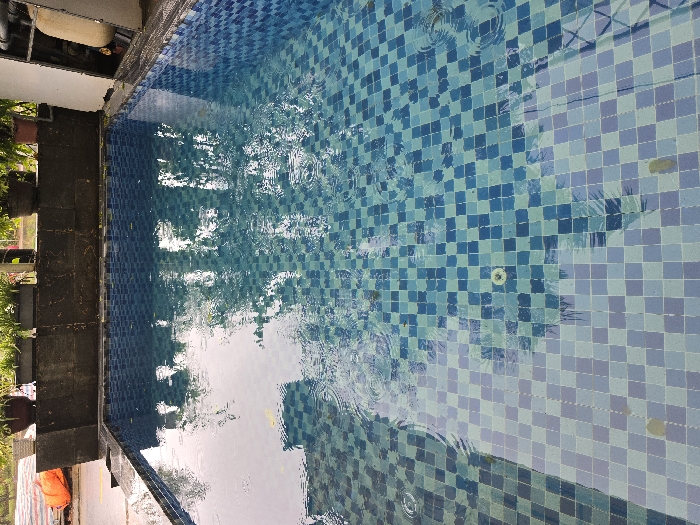 A mosaic tile swimming pool with rippling water reflecting the sky and surrounding trees. The tiles are blue and light blue. Raindrops create disturbances on the water's surface. The pool's edge is visible, constructed of dark gray tiles or stones. Vegetation and structures are partially visible near the pool's edge.