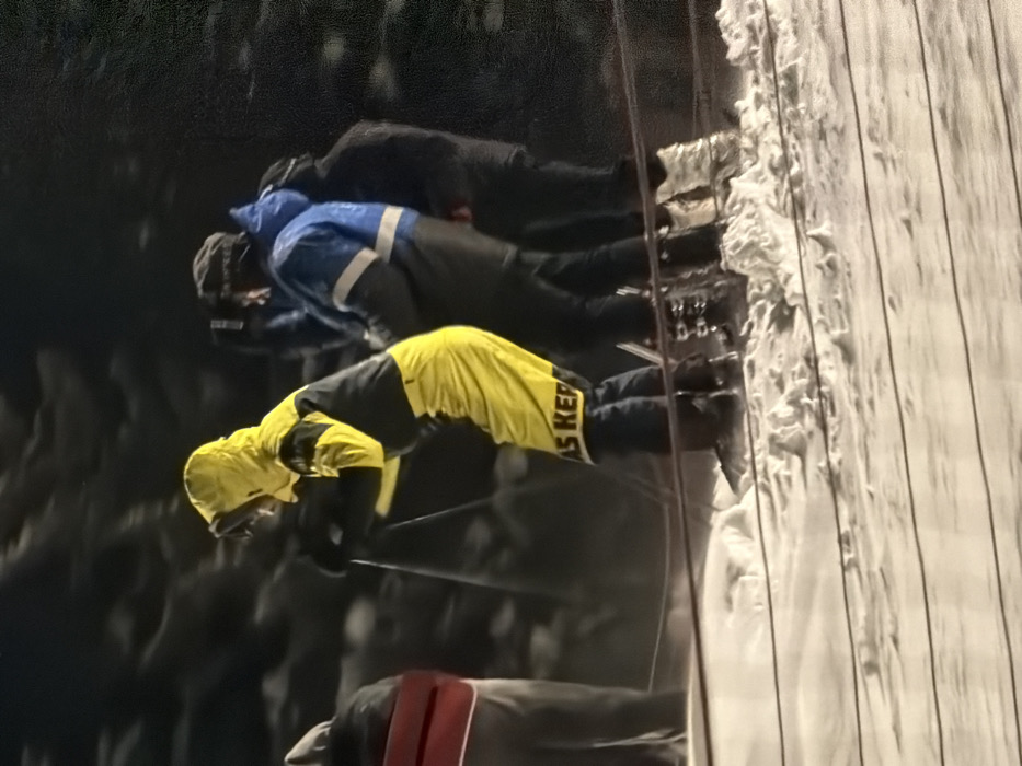 At night in Nechkino, Russia, a snowy outdoor scene depicts four individuals engaged in winter sports. The ground is covered in uneven, disturbed snow. Several dark, thin lines, resembling ropes or cables, are visible horizontally across the lower foreground. From left to right: The first individual is partially visible, wearing a grey jacket with a red horizontal stripe on the back. The second individual, central in the frame, wears a bright yellow and black hooded ski suit, with "AS KEP" text printed on the yellow lower leg, holding black ski poles, and standing on skis. The third individual wears a blue and black jacket with white horizontal stripes and a dark hat, standing on skis with dark ski boots. The fourth individual, mostly obscured by the third, is dressed in dark attire, with white ski boots visible. The background is dark, indicating nighttime, with indistinct dark shapes possibly representing trees or distant terrain.