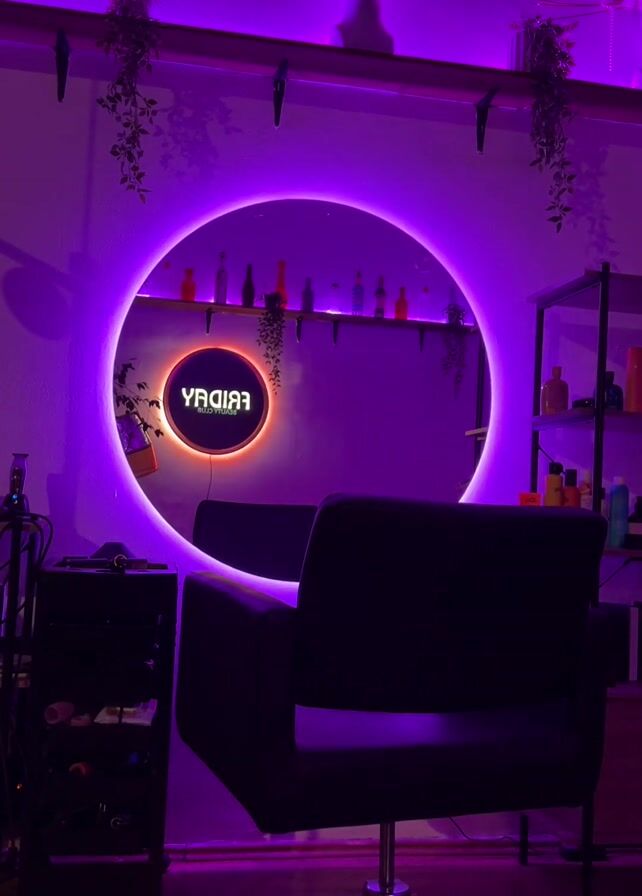 interior of a hair salon illuminated with purple neon lighting. A black stylist chair is positioned centrally, facing a large circular mirror with a glowing purple light border. Within the mirror's reflection, a neon sign displaying "FRIDAY" in reverse is visible, with the lighting pattern alternating between red and green. Above the mirror, a shelf displays an array of bottles and decorative items. To the left of the chair, a rolling cart holds various hair styling tools and products. A metal shelving unit with additional products stands on the right side of the frame. The walls are painted white, and hanging plants add a touch of greenery to the scene. The lighting creates a distinctly vibrant and modern aesthetic.