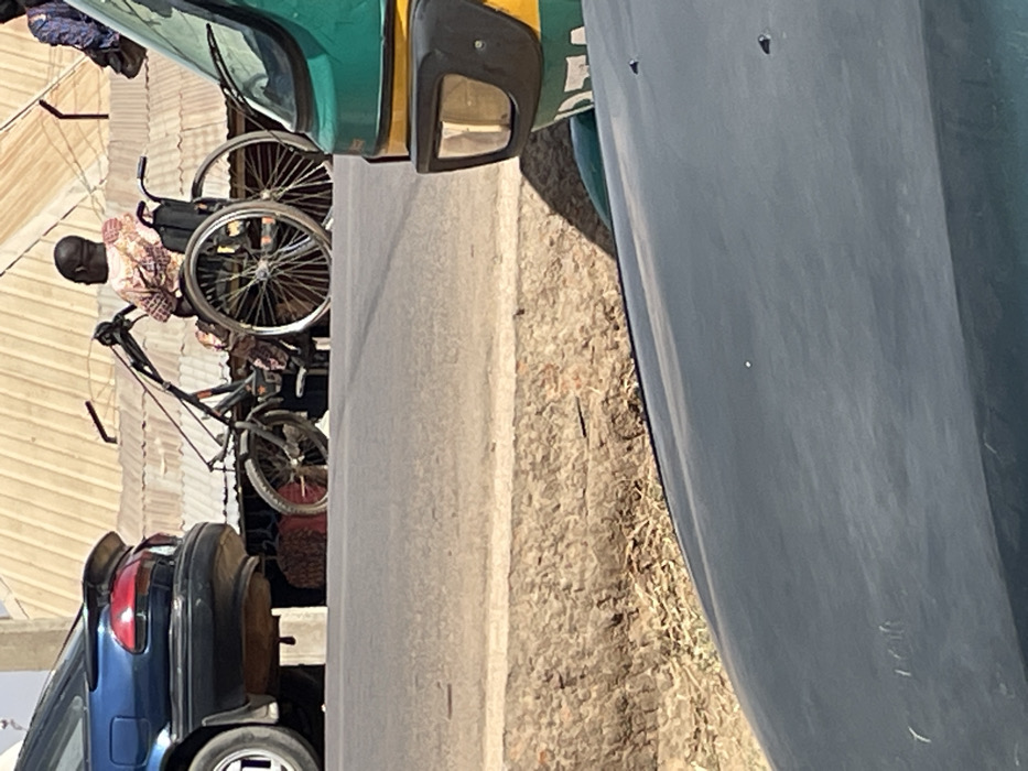 The scene on Rukuba Road, Nigeria, shows a street view from a low vantage point, possibly from inside a vehicle. The immediate foreground features the dark, glossy hood of a vehicle. In the mid-ground, a paved road surface is present, bordered by a rough, dry earthen verge. On the left side of the road, the rear section of a dark blue sedan, including its spoiler and left rear wheel, is visible. Below the sedan's bumper, obscured items, possibly bundled textiles, are discernible. To the right, the front-right portion of a green and yellow three-wheeled vehicle, consistent with a tuk-tuk, is partially visible, showing its headlight and fender. In the background, on the paved road, a male individual is seated in a specialized mobility device. This device appears to be a standard manual wheelchair modified with a two-wheeled front attachment, featuring handlebars and a smaller bicycle-style wheel, effectively creating a hand-powered trike. The individual, facing away from the camera, wears a light-colored, patterned long-sleeved shirt and has a shaved head. Behind the individual and vehicles, structures with weathered, light-colored corrugated metal roofs are visible under bright daylight conditions, suggesting a commercial or residential backdrop.