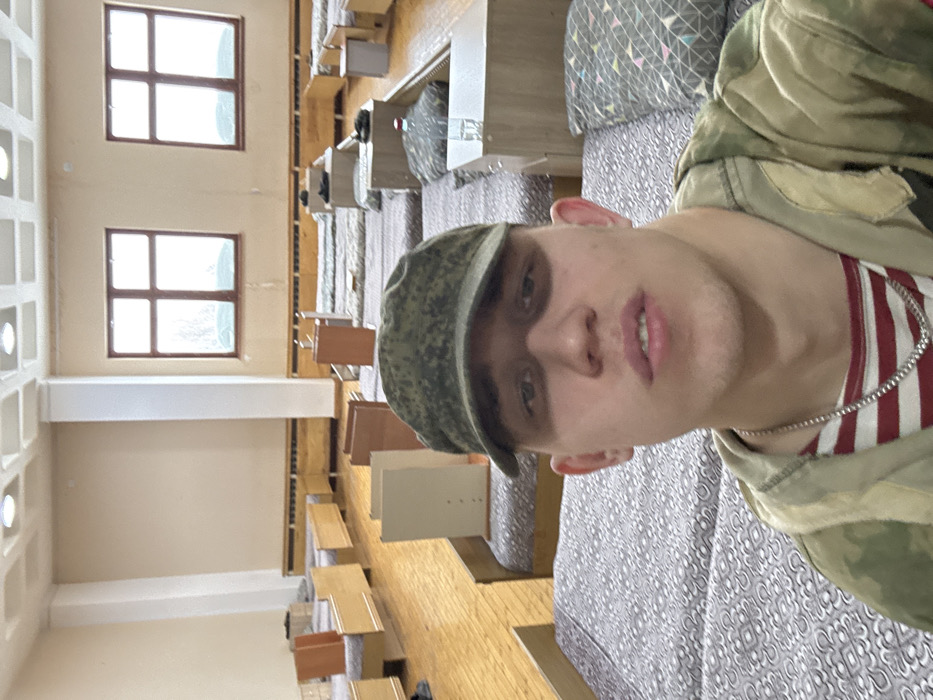 A male individual is positioned in the foreground, taking a selfie within a large, utilitarian dormitory or barracks room in Markovskii, Russia