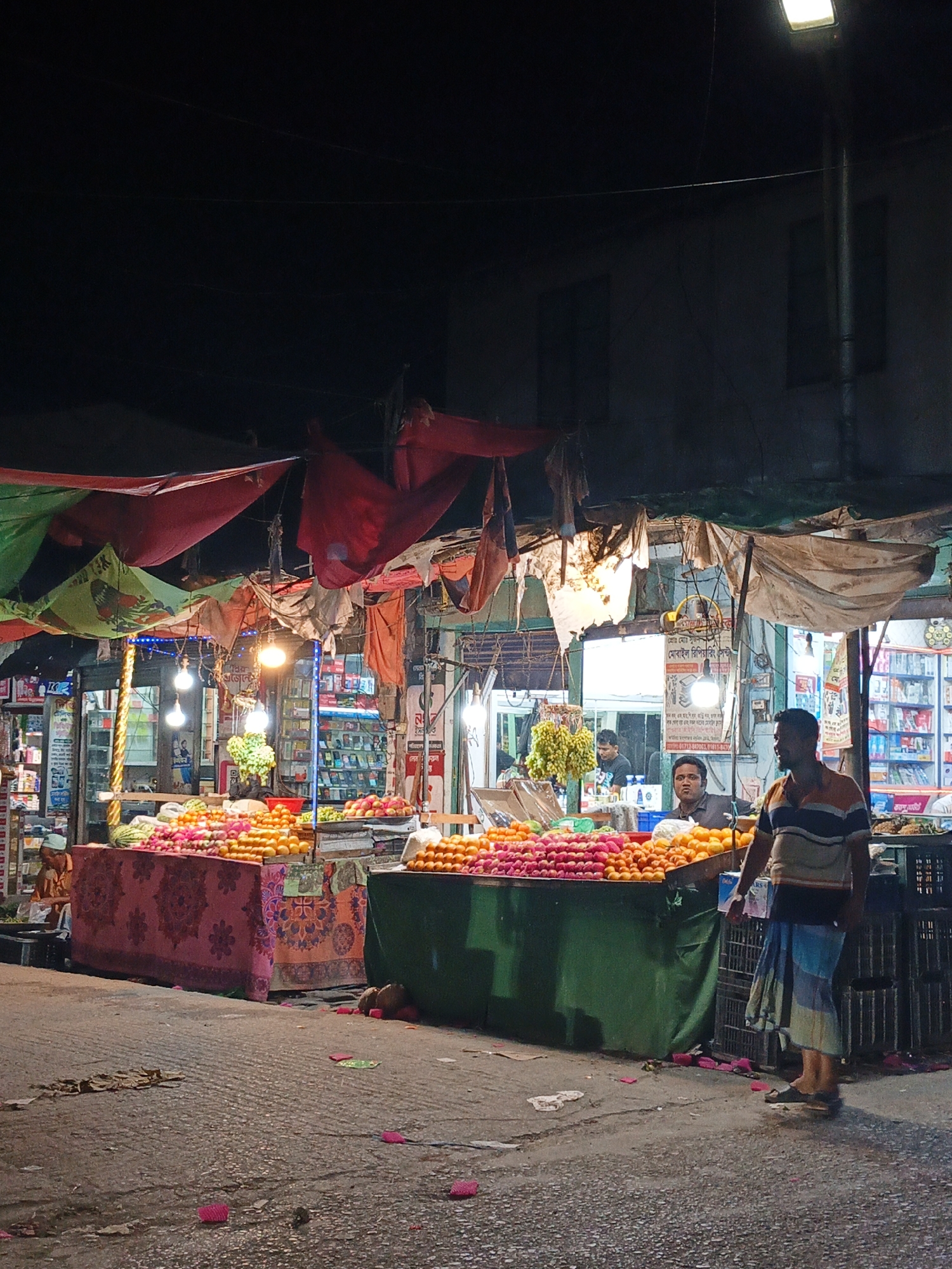 This image depicts a nighttime street market scene in Kauria, Bangladesh. The foreground shows a paved street with scattered debris, including dried leaves and small pink objects. To the mid-ground, two fruit stalls are prominent, heavily laden with produce such as oranges, red apples, green grapes, and watermelons. The stalls are draped with patterned fabrics, including a red-patterned cloth on the left stall and a green fabric on the right. Artificial lighting illuminates the market area, primarily from exposed incandescent bulbs hanging overhead, which are affixed to a makeshift awning structure composed of red, green, and off-white tarpaulins. A bright fluorescent streetlamp is visible in the upper right. Several individuals are present. In the immediate foreground to the right, a man stands, facing slightly left, wearing a horizontally striped t-shirt (orange, white, and blue) and a blue and white patterned lungi or sarong. He wears dark sandals. Behind the right fruit stall, a man with a dark shirt is seated, looking forward. Further left, partially obscured, another man in a light-colored cap is seated behind a stall. In the background, behind the fruit stalls, storefronts are visible, displaying shelves stocked with various products and featuring signage with Bengali script. One individual is visible inside a background shop. The upper background reveals a dark sky with faint power lines and the silhouettes of buildings with windows.