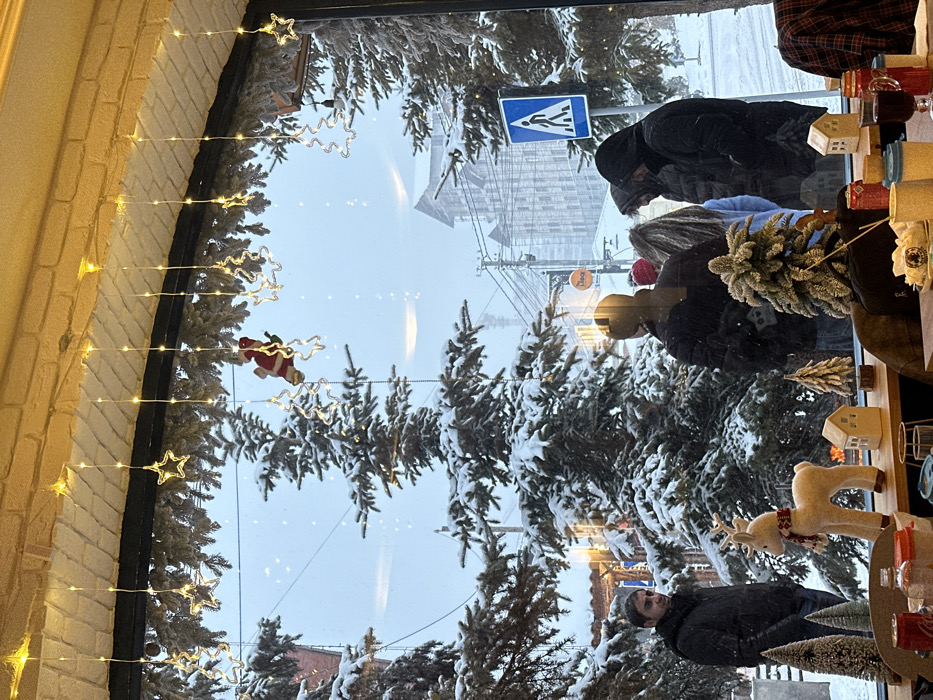 The image displays a winter scene in Tsakhkadzor, Armenia, observed from inside a building, likely a café or restaurant
