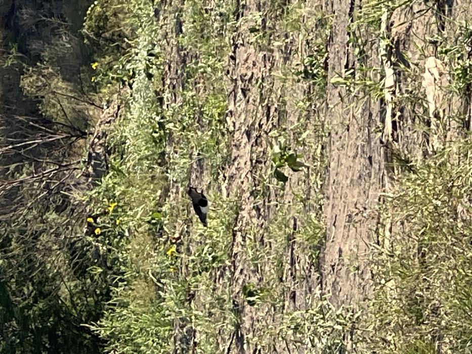 The image displays an outdoor, natural landscape characterized by sparse vegetation. The ground consists of dry, light-brown earth with patches of green grass and small plants. Several small yellow wildflowers are scattered throughout the mid-ground. A single Southern Lapwing (Vanellus chilensis), identifiable by its black head, white facial stripe, dark back, and white underparts, stands on the bare ground in the mid-left portion of the frame, facing right. In the background, denser green foliage, including shrubs and trees, forms a natural barrier. The scene is illuminated by natural daylight. Based on the natural, uncultivated appearance, the location is a natural or semi-wild area, potentially on the outskirts of San Fernando del Valle de Catamarca, Argentina. Specific geographical coordinates within the city cannot be determined from the visual evidence. No human subjects, structures, or discernible interactions are present.