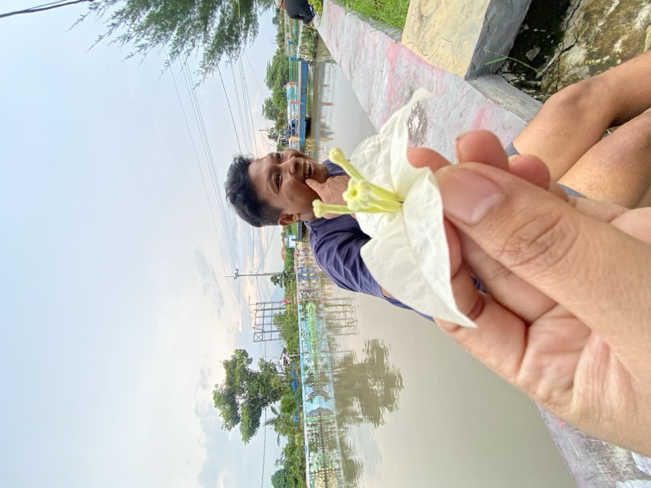 The image depicts an outdoor scene in Kalitengah, Indonesia. In the foreground, a human hand holds a white bougainvillea flower, prominently displaying its yellow-green stamens. Behind the flower, an adult male, of East Asian ethnicity, is seated, facing the camera with a wide smile, revealing teeth. His right index finger touches his lower lip. He wears a dark blue short-sleeved shirt, with his bare legs visible. The man is situated next to a body of murky brown water, which reflects the overcast, light grey sky. Concrete retaining walls flank the water; the wall to the left is adorned with colorful painted murals, while the wall to the right is grey with a red upper edge. The background includes green trees, a utility pole with wires, and distant structures. A light blue bridge is visible over the water in the far background, with a blue motorcycle and a partially obscured second individual positioned on its right side.